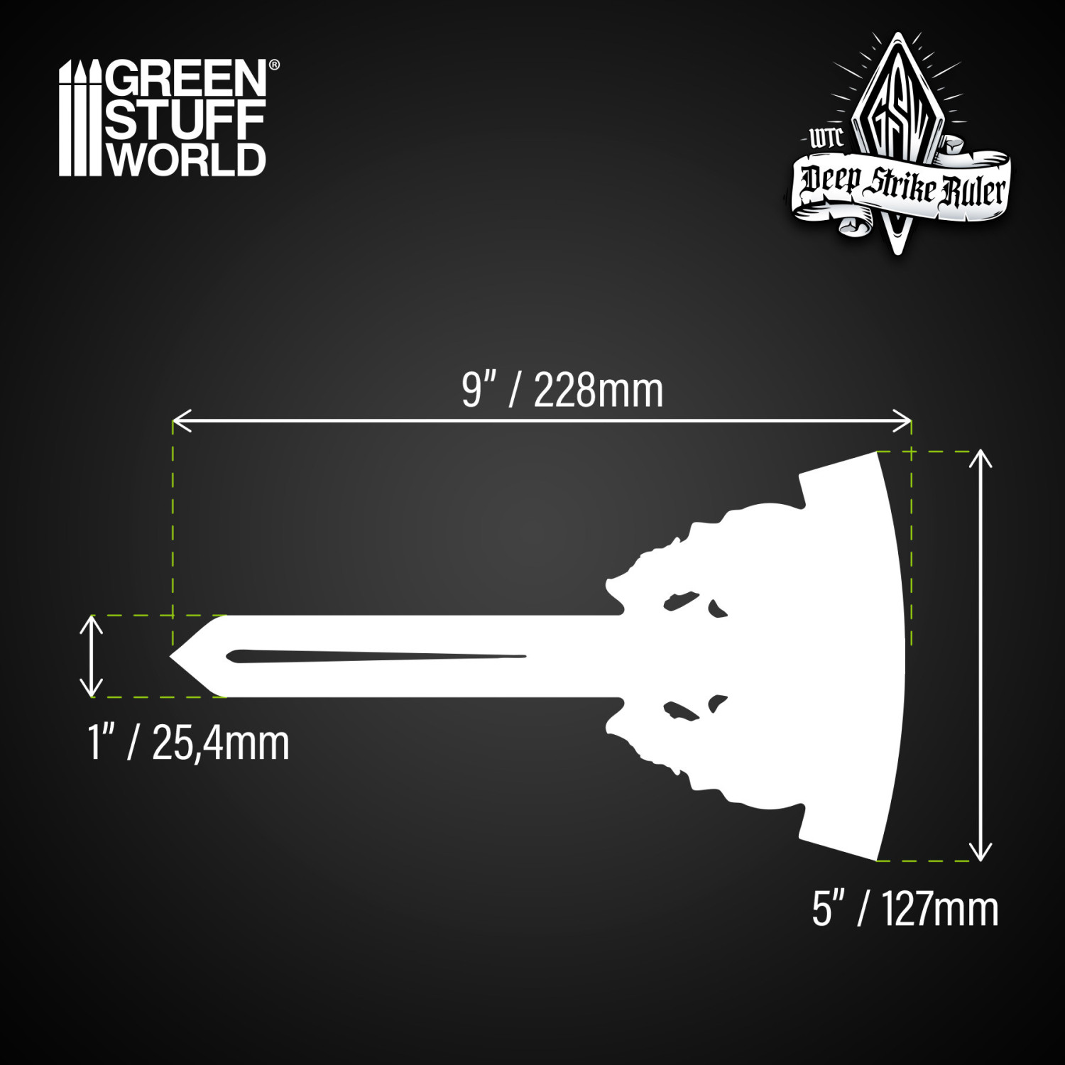 A 9-inch Deep Strike Ruler Template is a straight piece of measuring equipment with an arc-shaped exterior made of methacrylate that measures exactly nine inches—the critical clearance distance models must respect when they enter the table from reserves in Warhammer 40,000®. This 100% compatible tool is cut from 3 mm fluorescent acrylic and is 3mm thick, which is perfect to slip between tightly packed terrain pieces without disturbing them. Because the template is a single rigid piece rather than a tape measure, it can be laid flush against a model’s base and rotated to draw a perfect nine-inch exclusion zone in any direction.